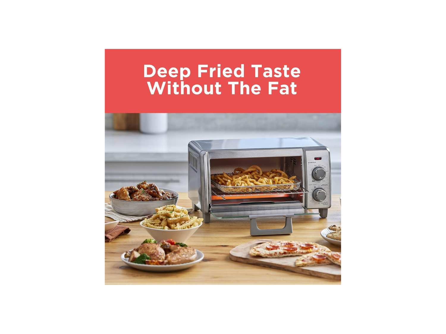 The oven includes five versatile cooking functions: Air Fry, Bake, Broil, Toast, and Keep Warm, giving you multiple options for preparing everything from crispy French fries and chicken wings to baked casseroles and reheated leftovers. Two control knobs simplify operation, letting you set the 30-minute timer and choose from the five cooking functions with ease, eliminating complicated digital displays and making the oven accessible for all ages.